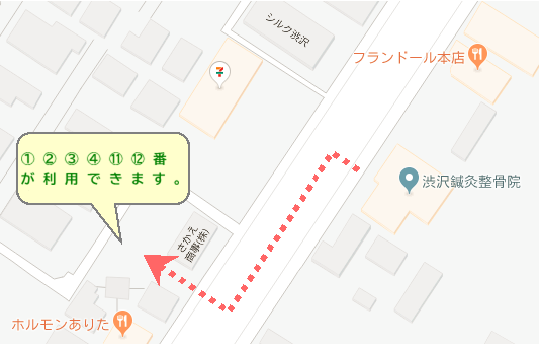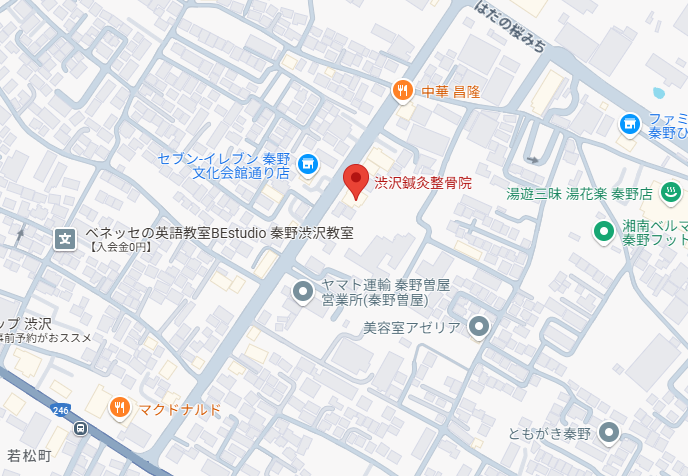周辺地図 ナビに「渋沢鍼灸整骨院」か「0463-87-7870」で案内されます 地図にタッチするとGoogleMapが表示されます 駐車場は治療院前に6台、大通りの斜め向かいに6台あります。 ※道路の横断の際には交通に充分お気をつけ下さい。 治療室前の看板の横に駐車の際には、となりの車の出入りをスムーズにするため、黄色い斜線の部分を避けて止めていただけますよう、よろしくお願いいたします。 電車の場合 渋沢駅より約1Km徒歩13分 小田急線渋沢駅北口を出て、国道246線を秦野方向へ。3つめの信号 (若松町)を左に曲がり300m先です。